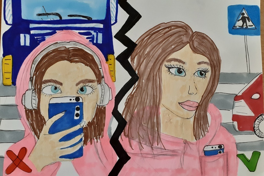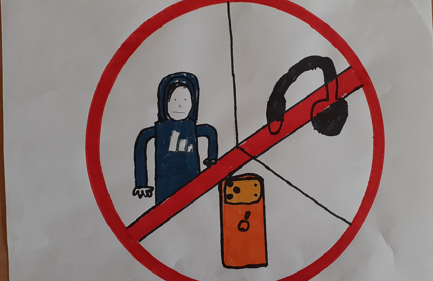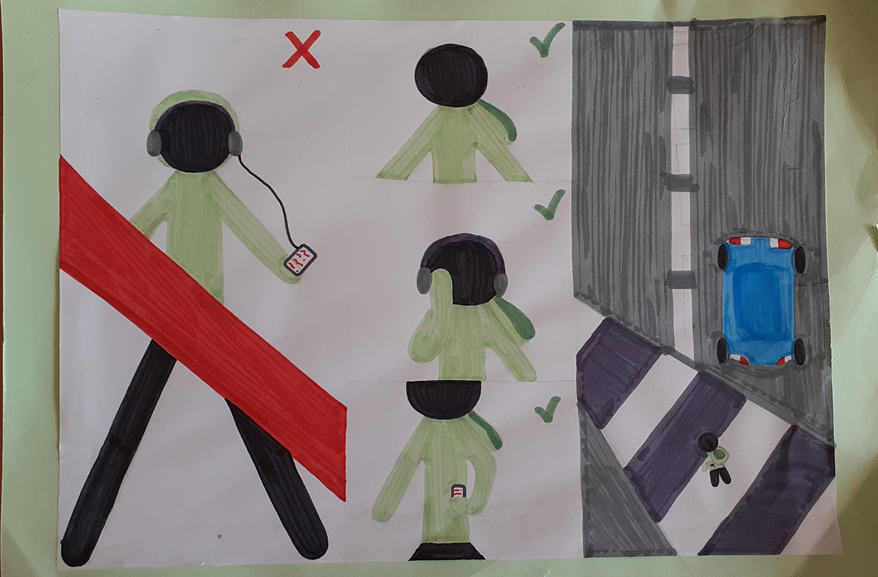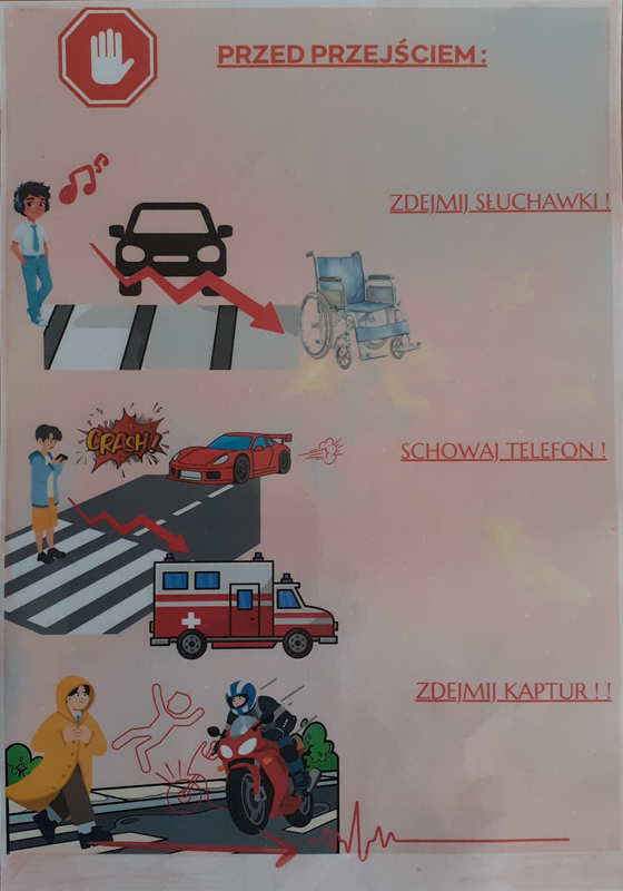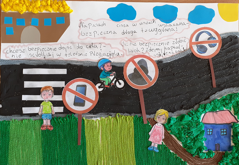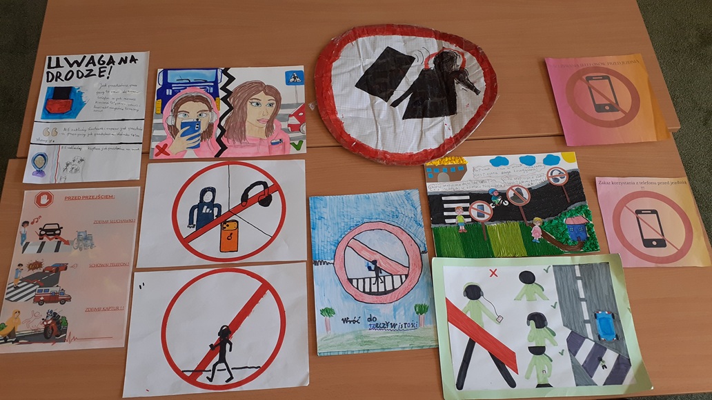 Plakaty pokazują dobitnie: technologia i kaptur to bariery, które na przejściu dla pieszych mogą doprowadzić do tragedii. Jesteśmy dumni z dojrzałej postawy naszych uczniów! BRAWO !!!