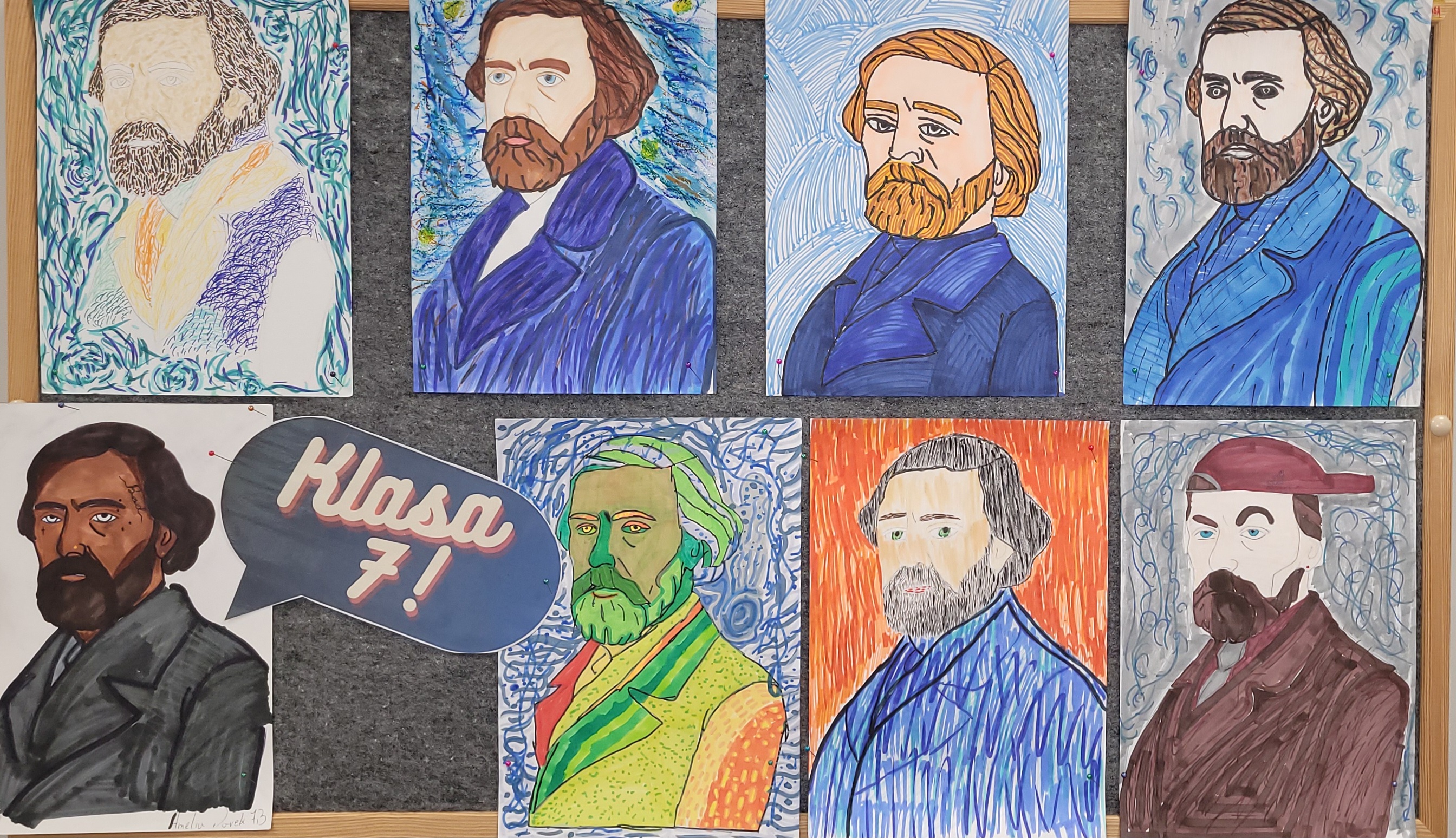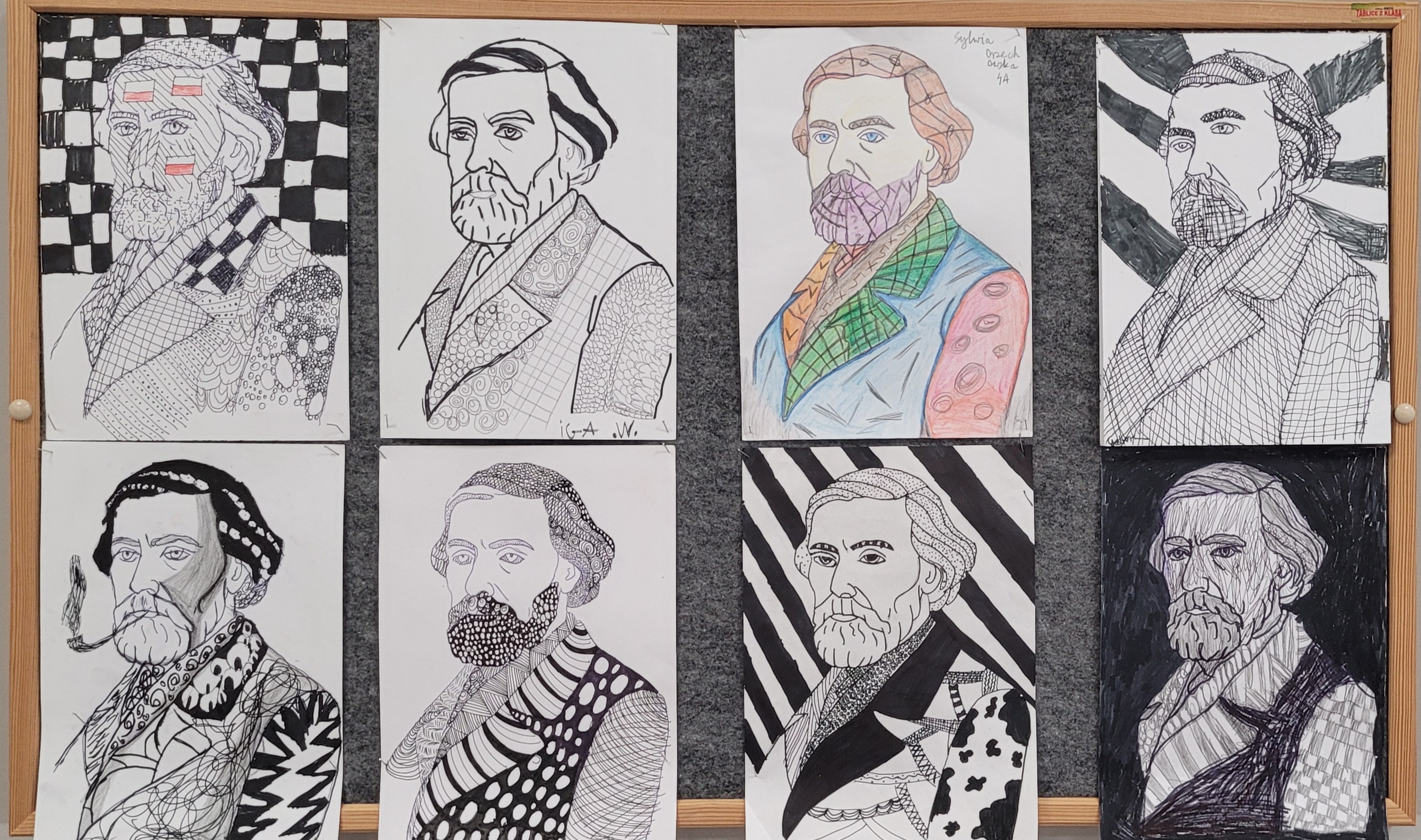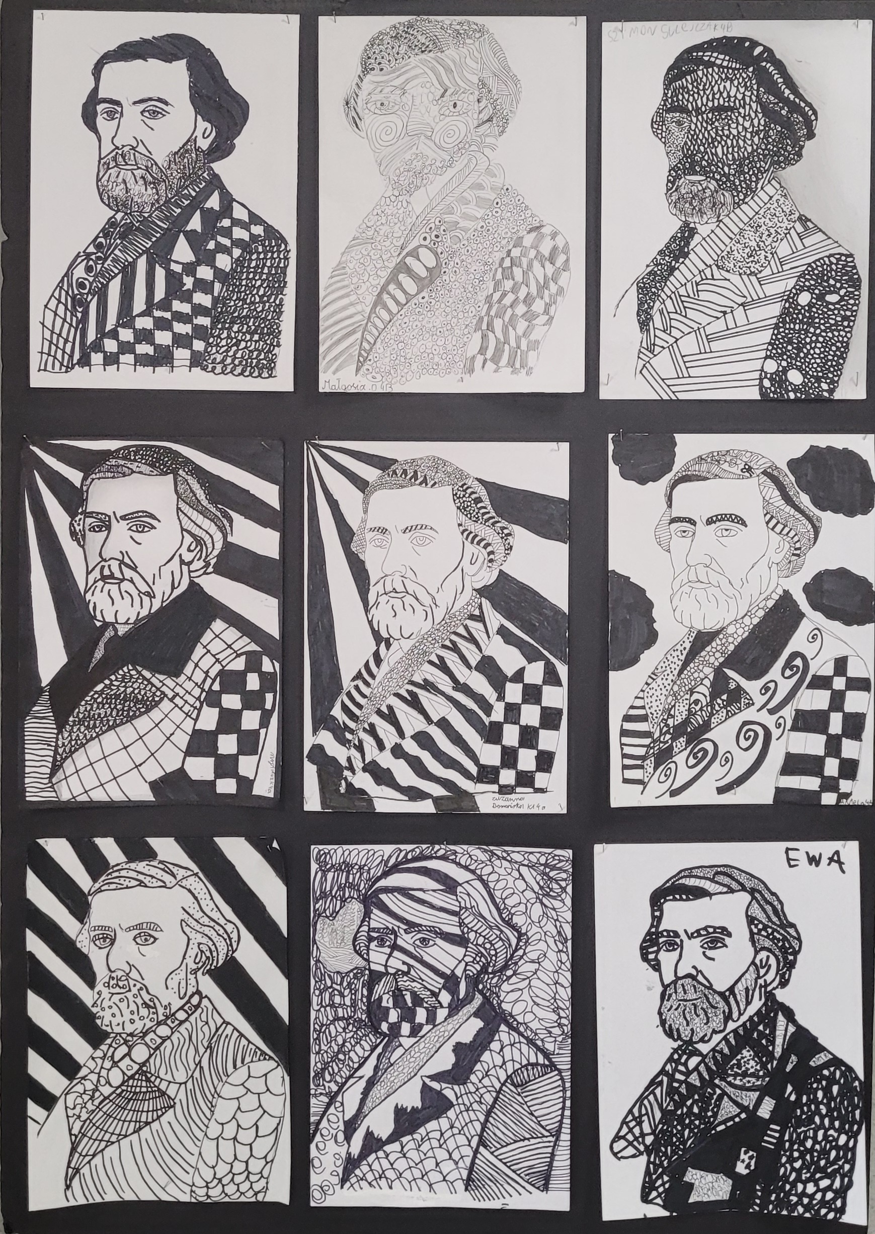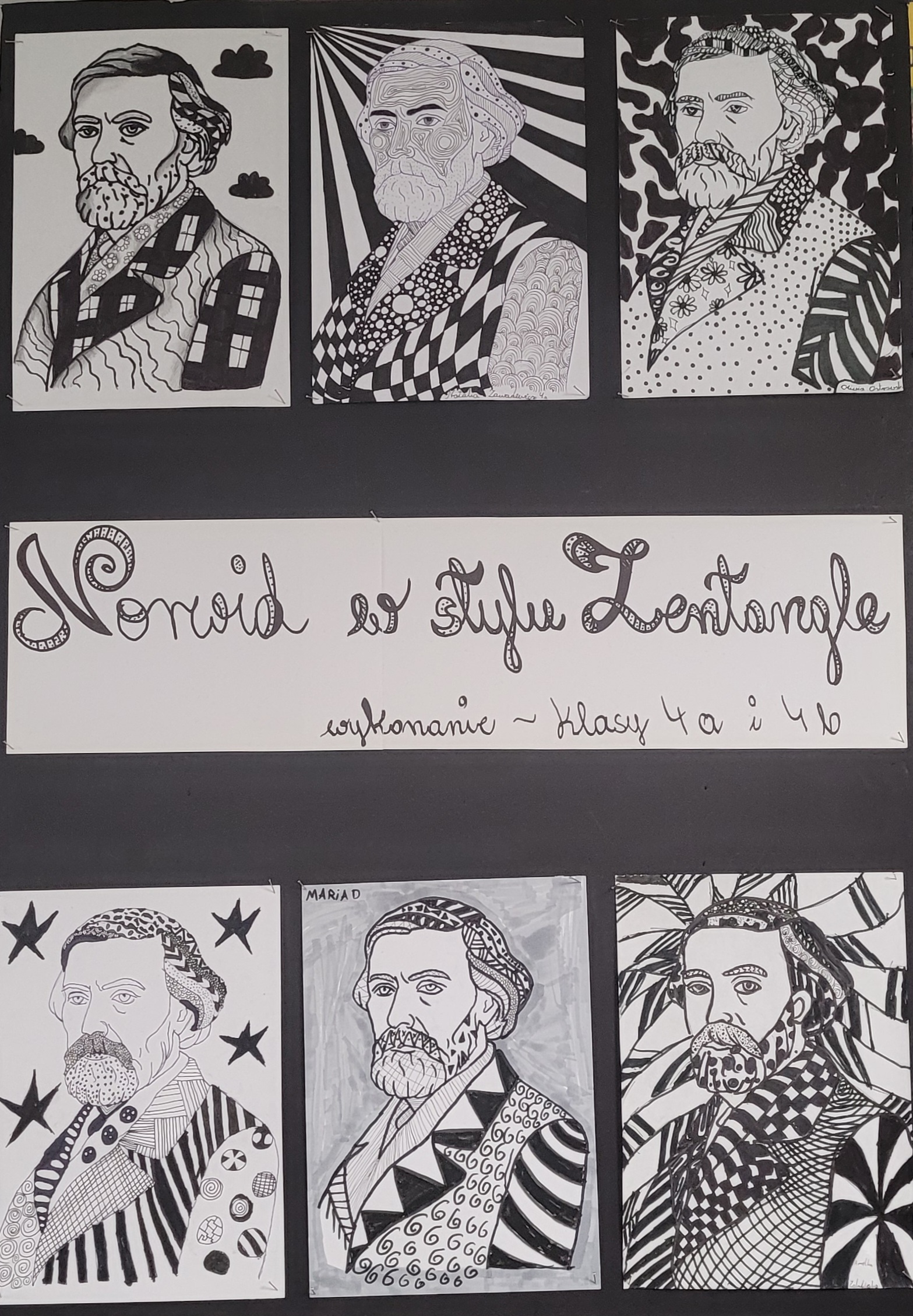 24.09.25 r. obchodziliśmy Święto Szkoły, urodziny naszego patrona - Cypriana Kamila Norwida. Z tej okazji uczniowie klas 4 -7 podczas lekcji plastyki stworzyli przepiękne portrety inspirowane różnymi stylami w sztuce. Powstały portrety Norwida w stylu zentangle, Norwid w obrazie Edvarda Muncha "Krzyk", Norwid w stylu Mona Lisy Leonarda da Vinci, puentylizmu, impresjonizmu Vincenta Van Gogha, czy pop art Andy'ego Warhola.