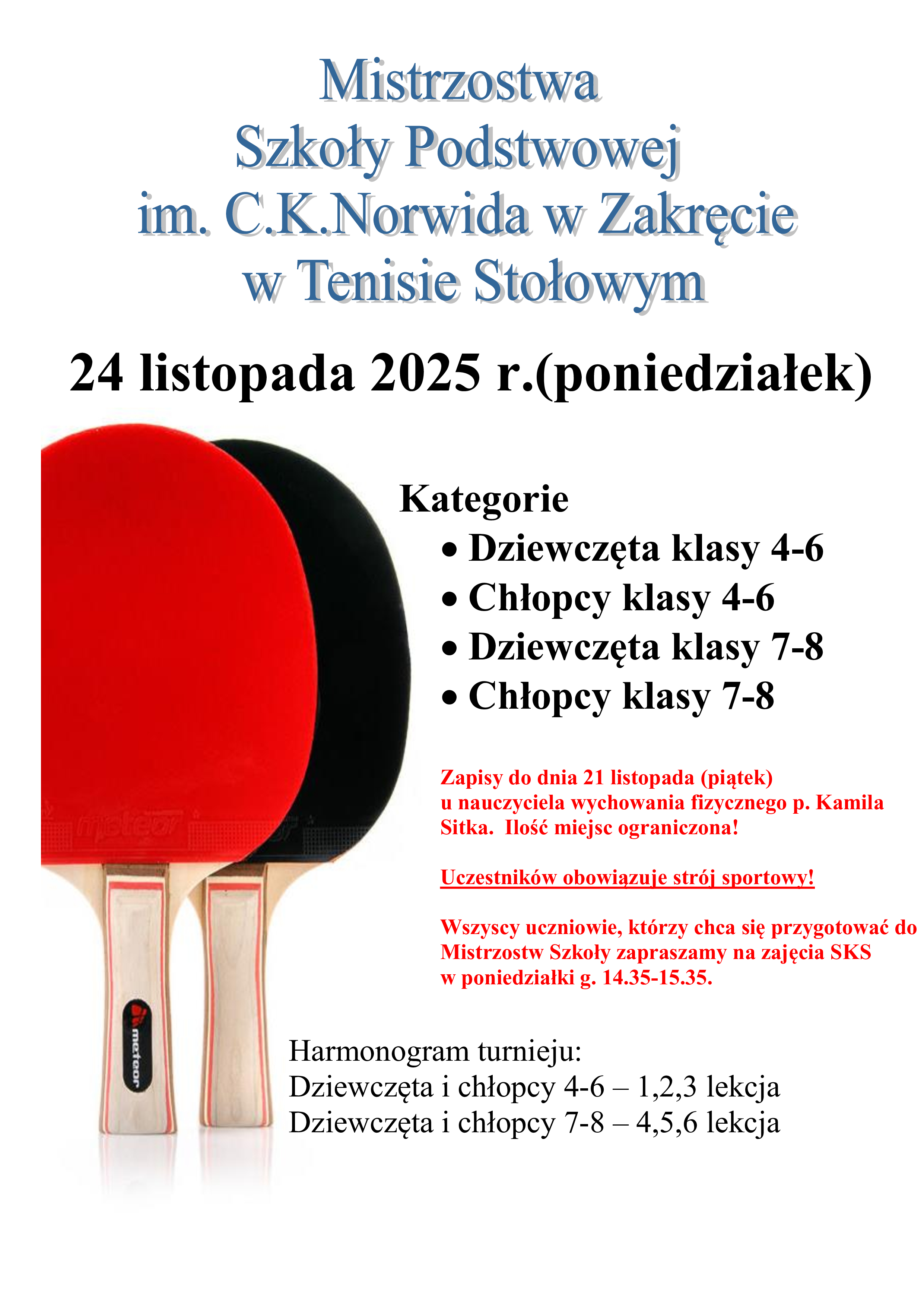 Zapraszamy wszystkich uczniów do udziału w Mistrzostwach Szkoły w Tenisie Stołowym, które odbędą się 24 listopada 2025 r. (poniedziałek).
