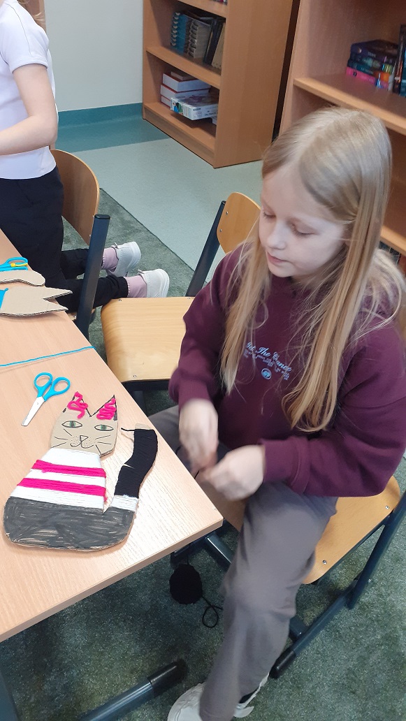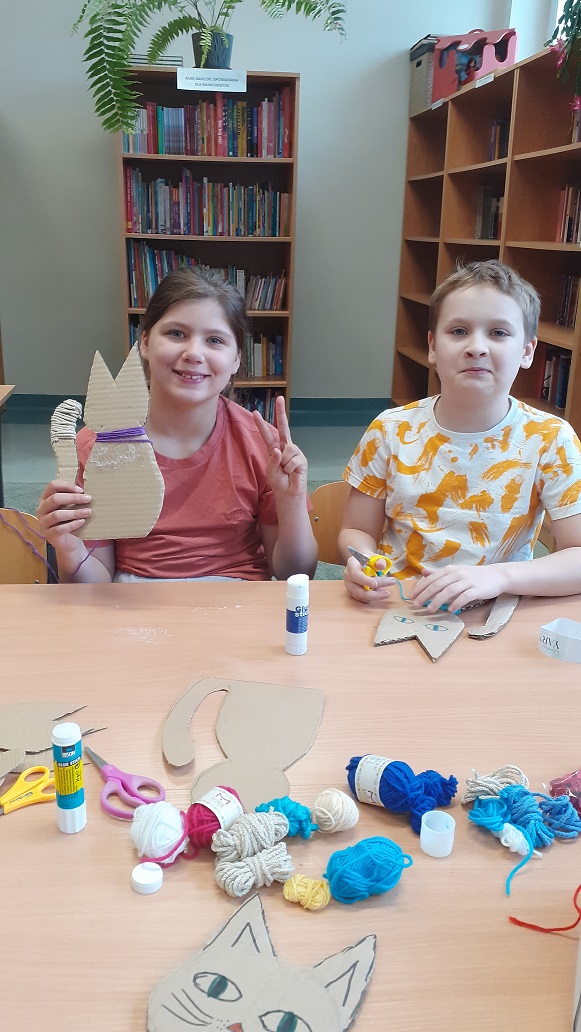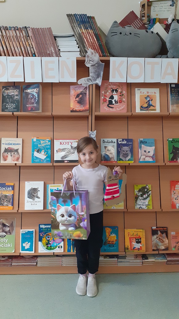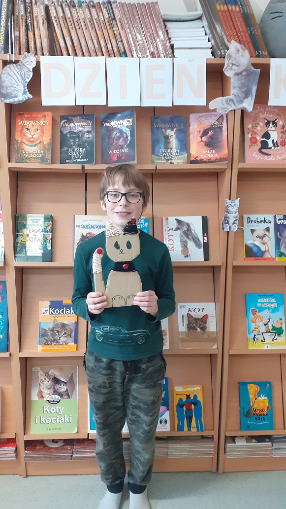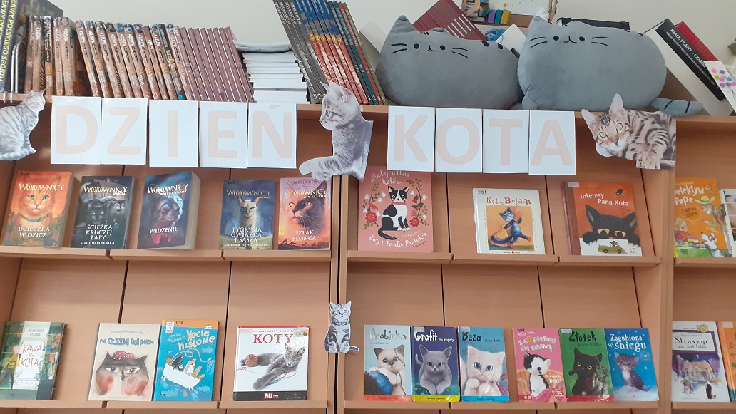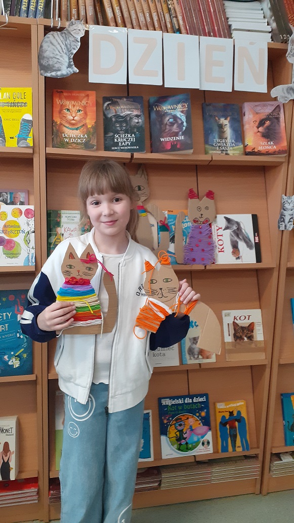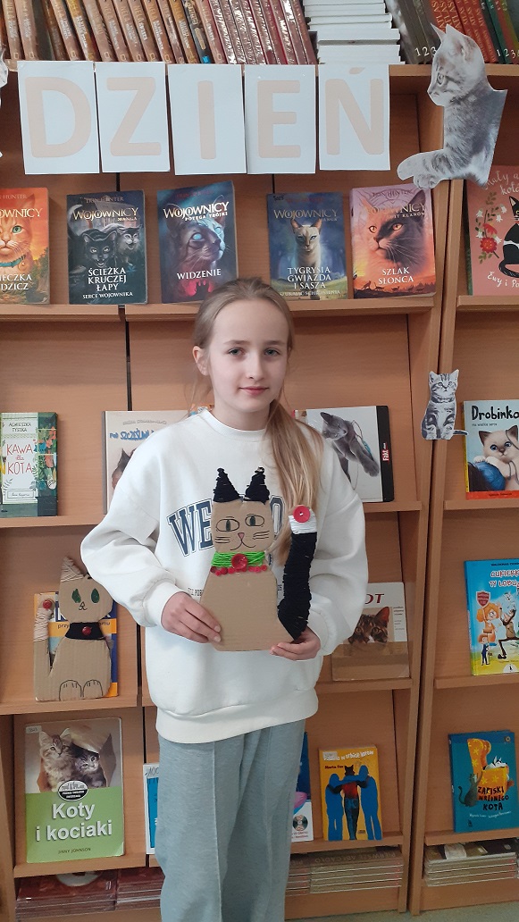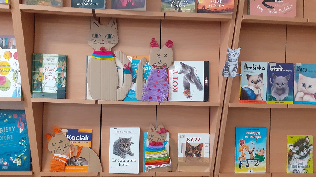 W naszej szkolnej bibliotece zrobiło się wyjątkowo przytulnie i... literacko! Z okazji Światowego Dnia Kota zorganizowaliśmy wyjątkowe zajęcia poświęcone tym niezwykłym czworonogom. To był dzień pełen pasji, kreatywności i oczywiście miłości do książek. Z okazji tego wyjątkowego święta przygotowaliśmy specjalną wystawę książek o kotach, która przyciągała wzrok każdego, kto przekroczył próg biblioteki. Nasi czytelnicy z ogromnym zaciekawieniem odkrywali historie o kocich przygodach, a wśród najchętniej oglądanych i wypożyczanych tytułów znalazły się: „Cukierku, ty łobuzie!”, seria „Wojownicy”, seria „Zaopiekuj się mną”, „Kocia mama i jej przygody”, „Kocia szajka…” Niezwykle radosnym momentem spotkania były rozmowy o czworonożnych domownikach. Uczniowie z wielkim entuzjazmem opisywali swoich pupili, prześcigając się w zabawnych anegdotach o ich psotach i nietypowych przyzwyczajeniach. Po literackich emocjach nadszedł czas na twórcze działanie! Biblioteczna przestrzeń zamieniła się w kolorową pracownię, w której uczniowie tworzyli własne kocie postacie z wcześniej przygotowanych szablonów. Efektem tej pracy były przepiękne koty, z których każdy miał swój niepowtarzalny styl i urok. Serdecznie dziękujemy wszystkim uczestnikom za wspólną zabawę i zachęcamy do wypożyczania „kocich lektur” nie tylko od święta!