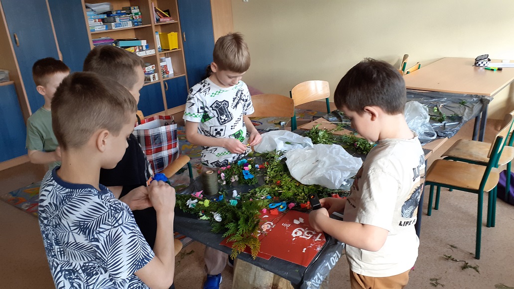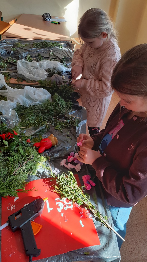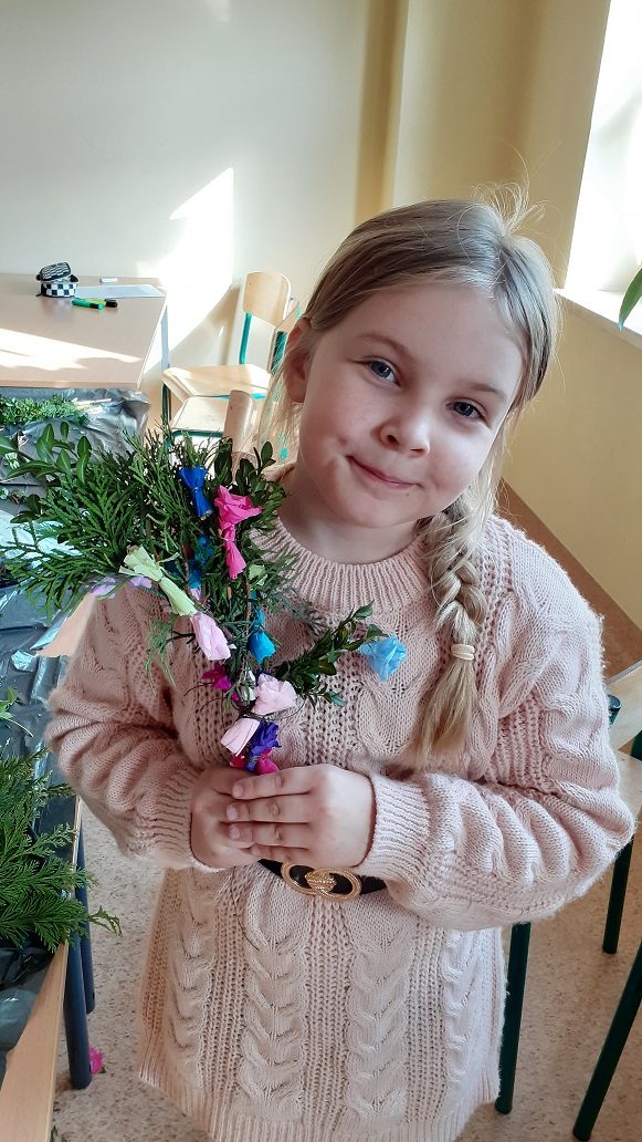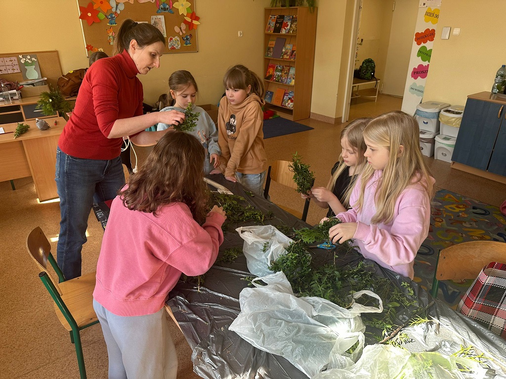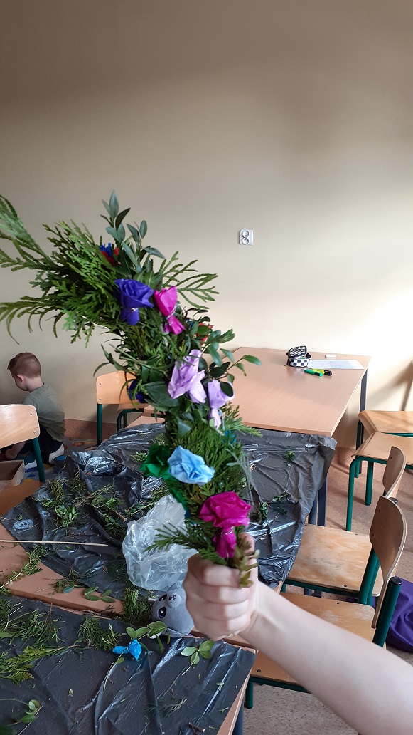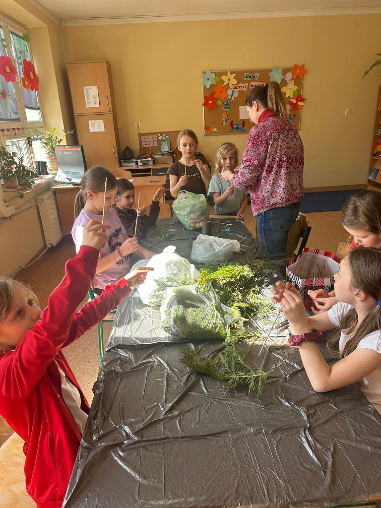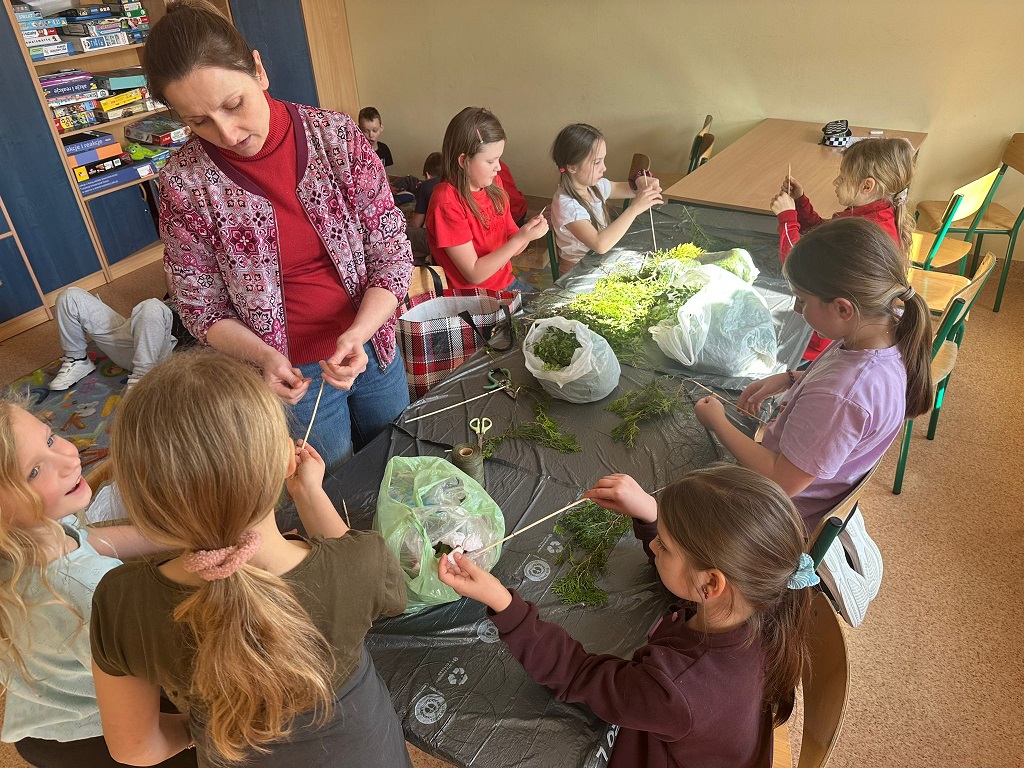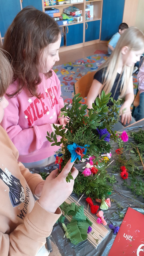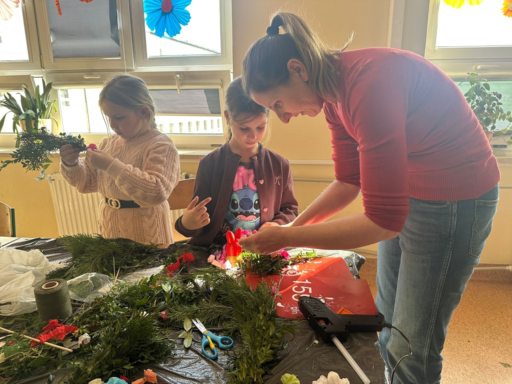 W naszej szkolnej świetlicy zapanował radosny, przedświąteczny nastrój. Chętni uczniowie z klas drugich udowodnili, że mają ogromne talenty, tworząc przepiękne palmy wielkanocne. Dzieci z wielkim zaangażowaniem wybierały i układały kompozycje z zielonych gałązek, które następnie dekorowały kolorowymi kwiatami wykonanymi z bibuły. Każda palma to efekt cierpliwości i pomysłowości naszych młodych twórców. Wspólne tworzenie palm było nie tylko okazją do świetnej zabawy, ale także do rozmów o polskich tradycjach. Brawo dla naszych młodych artystów za pielęgnowanie pięknych tradycji!