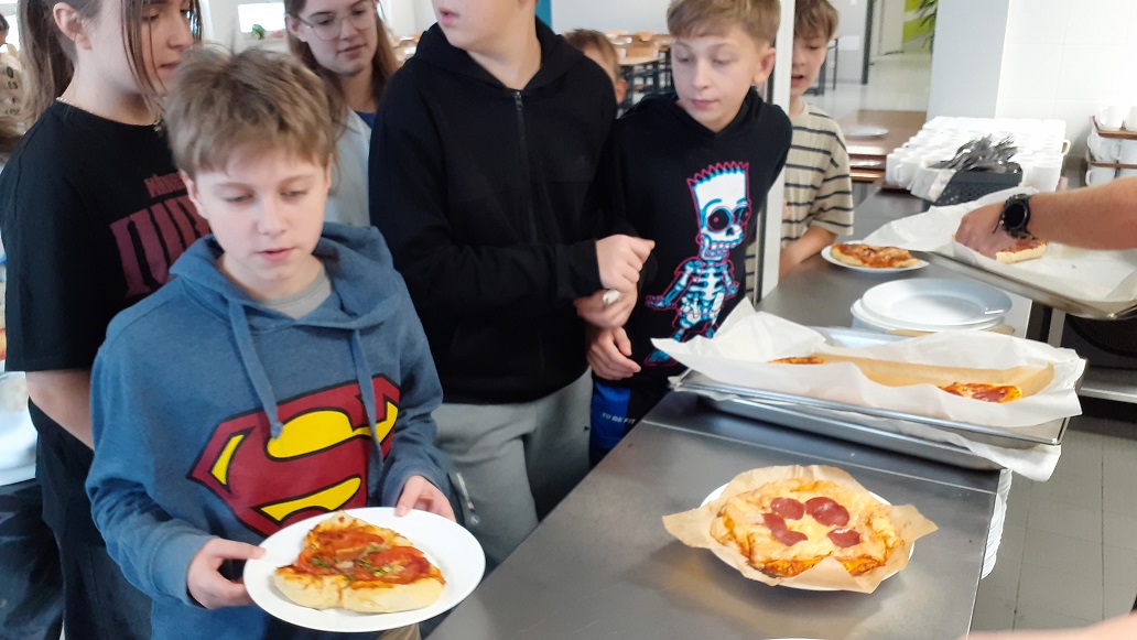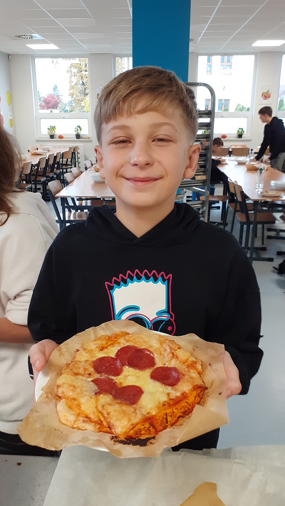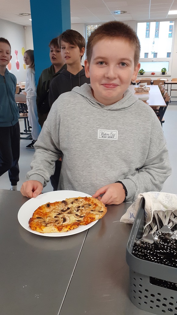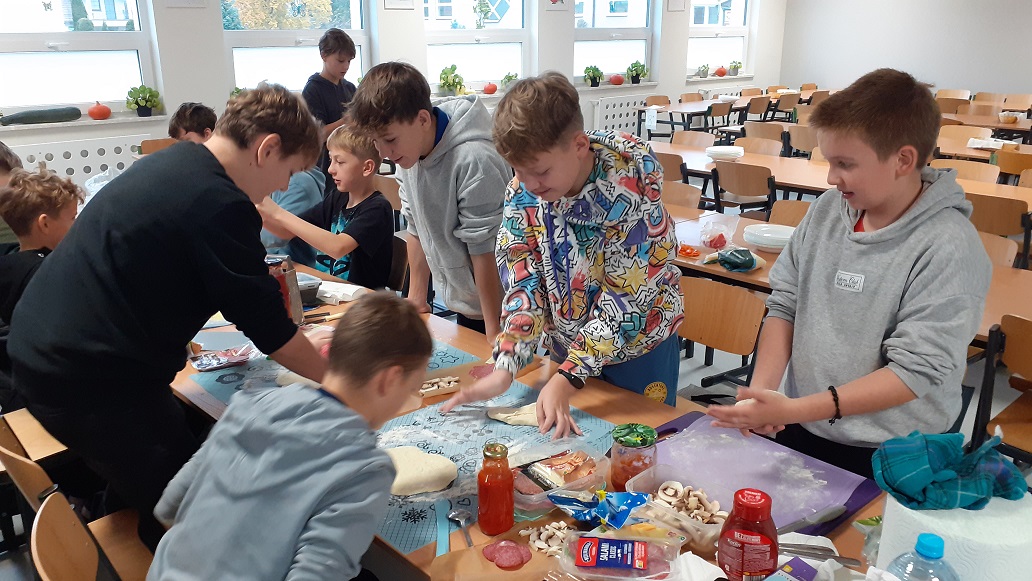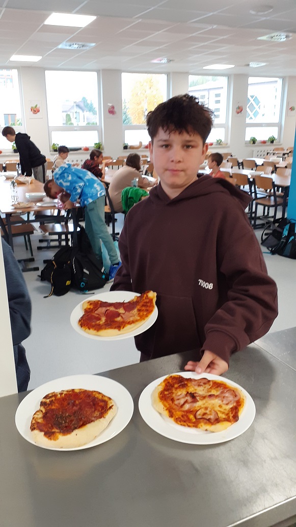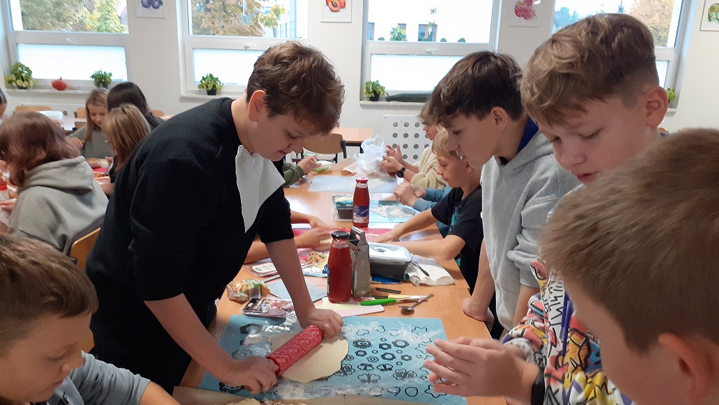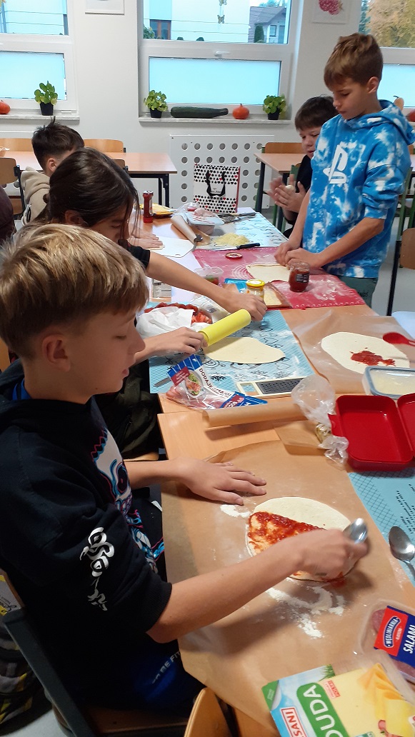 Na ostatnich zajęciach techniki klasy 6 wzięły udział w warsztatach kulinarnych poświęconych sztuce wypieku pizzy. Uczniowie samodzielnie przygotowywali swoje kompozycje smakowe, przynosząc z domu ulubione składniki – sery, szynki, warzywa i sosy. O ciasto zatroszczyli się nasi szkolni kucharze p. Natalia i p. Sebastian, dzięki czemu uczniowie mogli od razu przystąpić do formowania placków i układania dodatków.