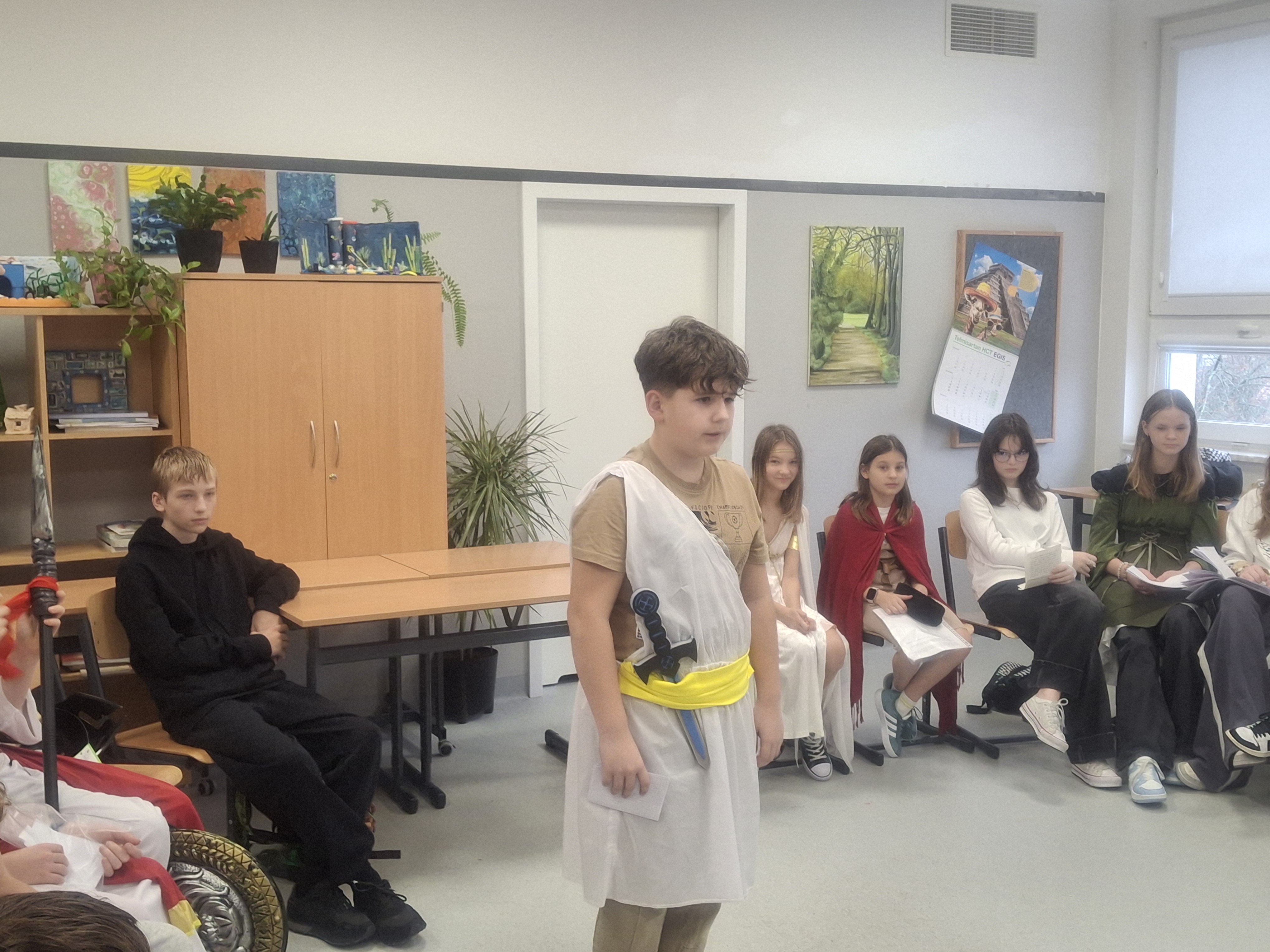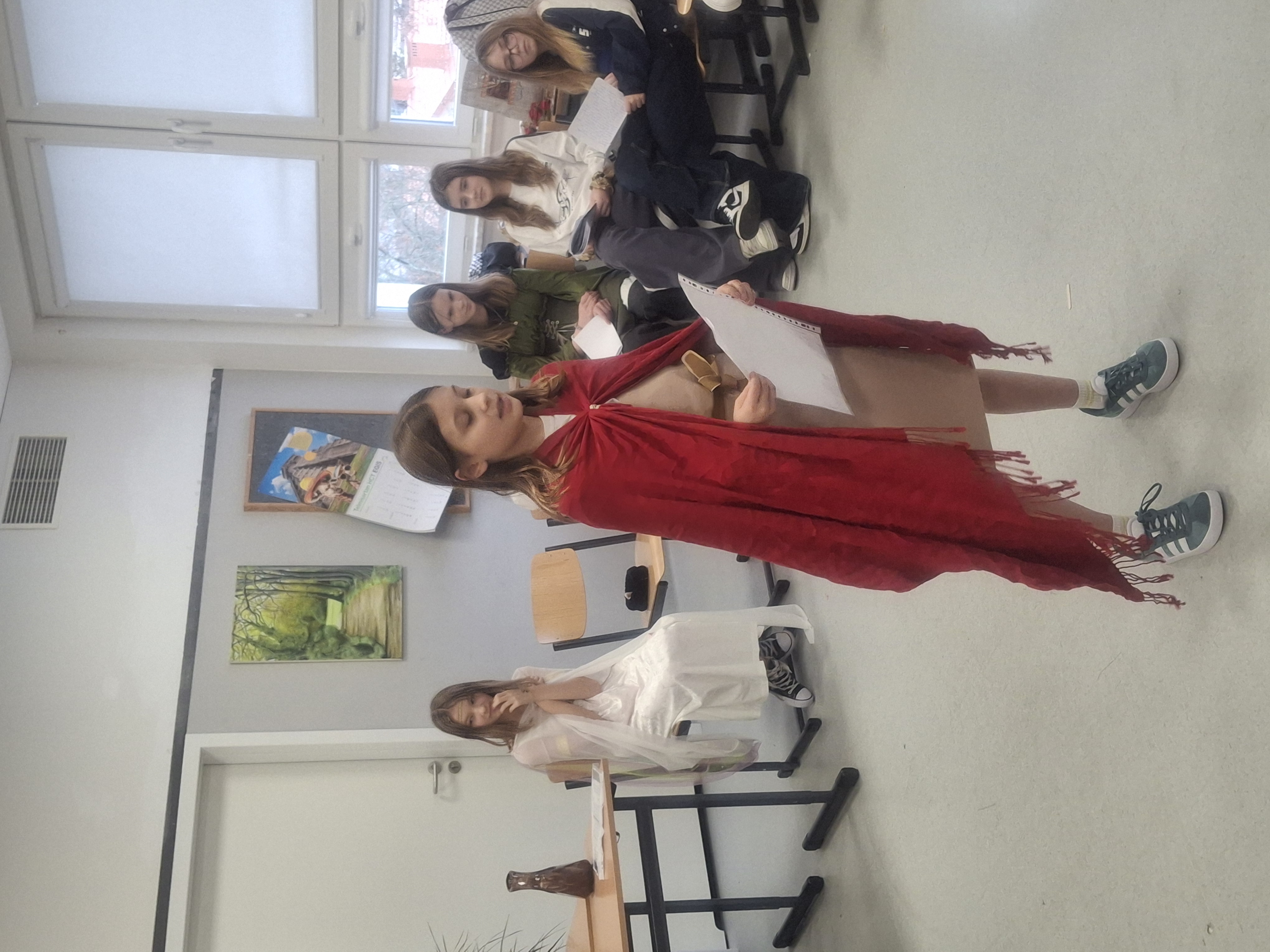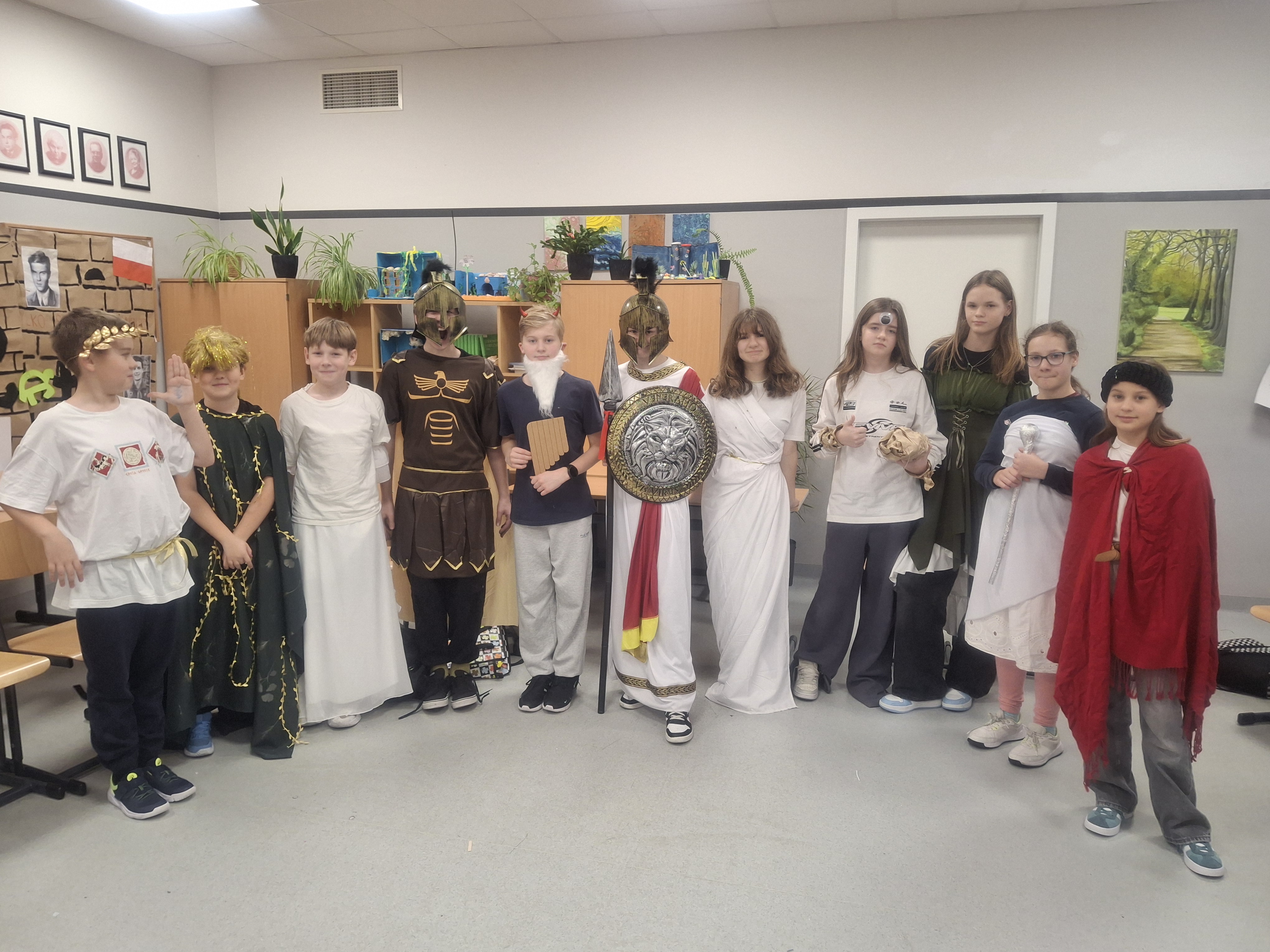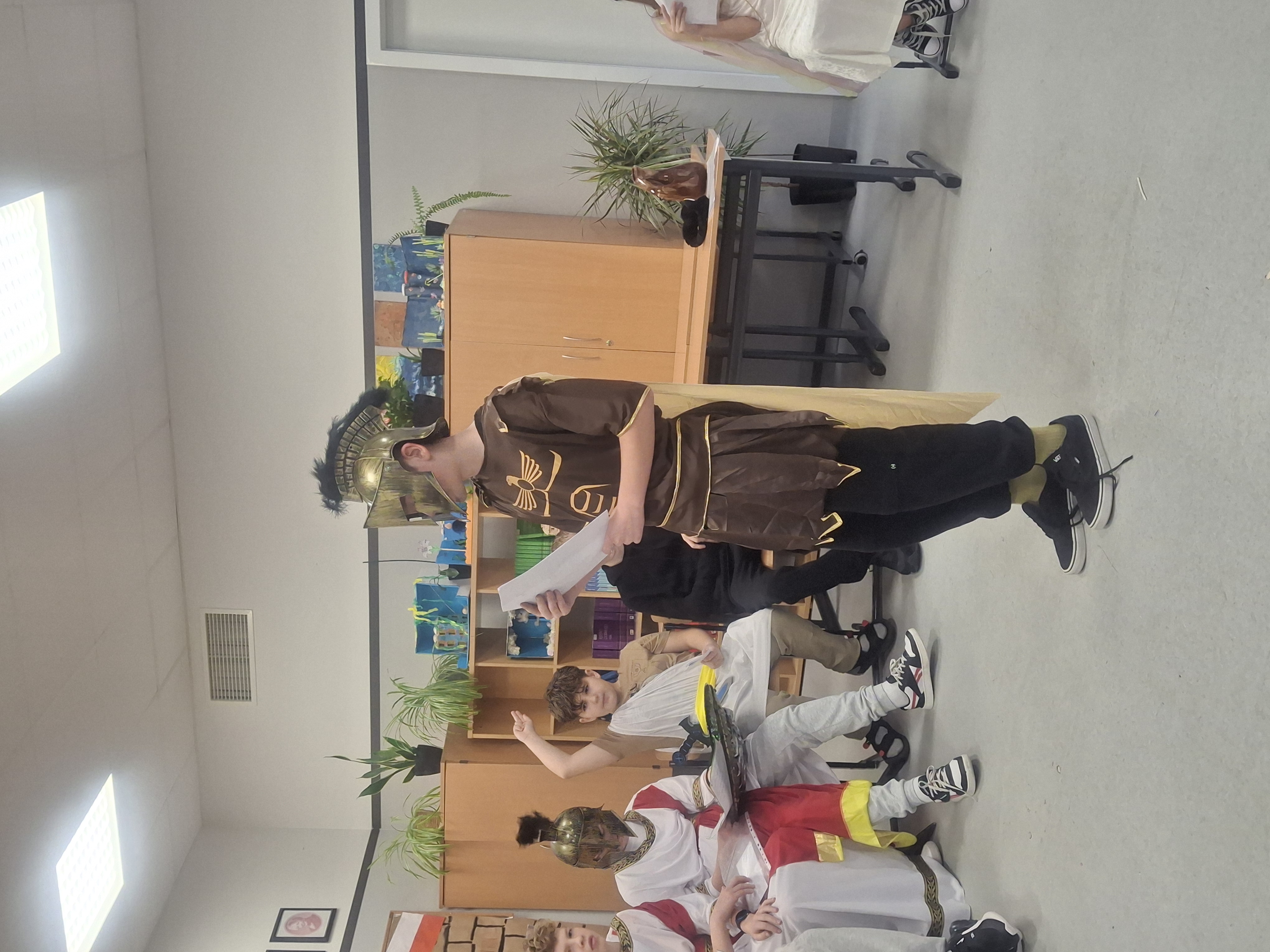 Prezentacje łączyły wiedzę merytoryczną z kreatywnością – uczniowie przygotowali stroje, rekwizyty oraz krótkie wystąpienia, dzięki którym mogliśmy przenieść się do świata starożytnej Grecji. Wydarzenie było nie tylko okazją do nauki, ale także świetnej zabawy i rozwijania umiejętności wystąpień publicznych.