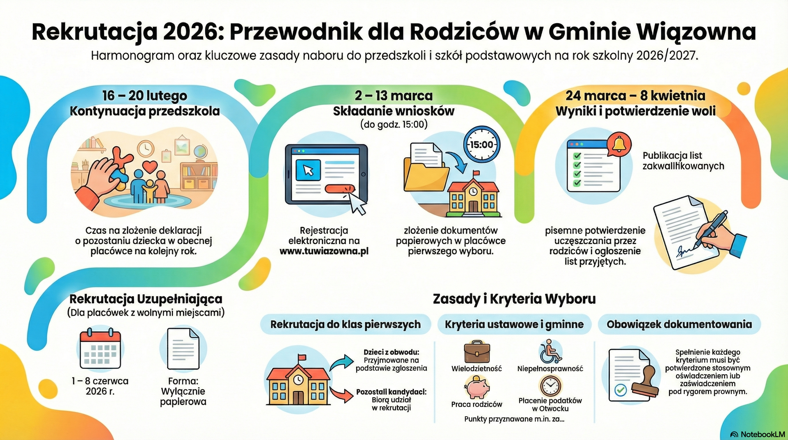 Harmonogram czynności w postępowaniu rekrutacyjnym oraz postępowaniu uzupełniającym na rok szkolny 2026/2027 do przedszkoli i oddziałów przedszkolnych w szkołach podstawowych, dla których organem prowadzącym jest Gmina Wiązowna oraz terminy składania dokumentów