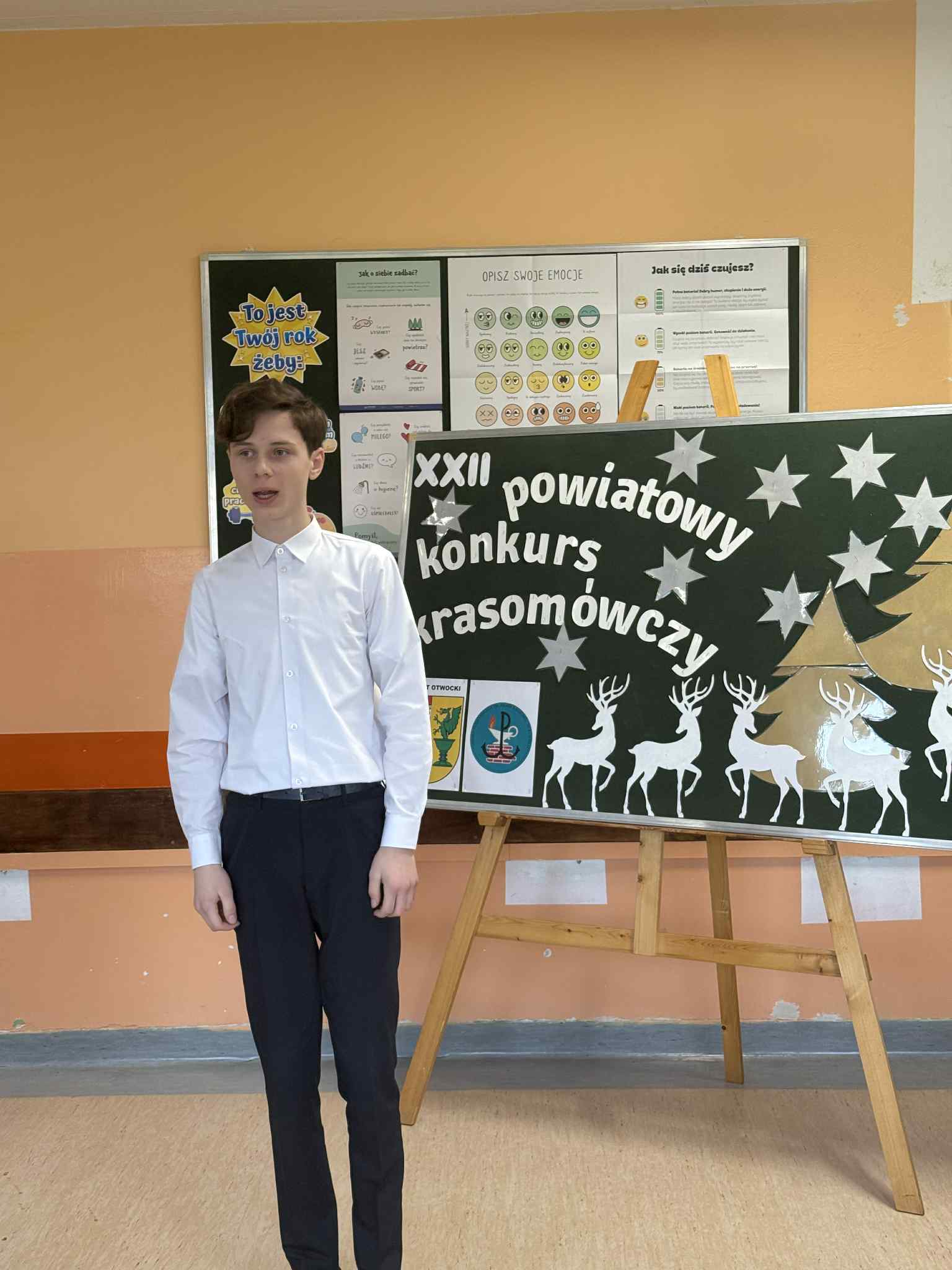 W konkursie wzięli udział uczniowie reprezentujący szkoły z całego powiatu, w tym również Szkołę Podstawową im. Cypriana Kamila Norwida w Zakręcie. Naszą szkołę reprezentowali Karol Mieczkowski oraz Maja Kaczyńska, którzy z pełnym zaangażowaniem zaprezentowali swoje umiejętności oratorskie. Ich wystąpienia, podobnie jak pozostałych uczestników, zachwycały dojrzałością słowa, oryginalnością tematów oraz świadomym budowaniem kontaktu z publicznością. Przygotowane teksty były efektem długich poszukiwań inspiracji i wytrwałej pracy nad formą przekazu.