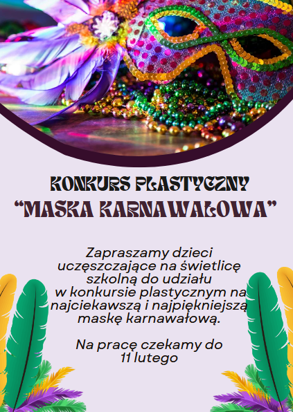 Zapraszamy dzieci uczęszczające na świetlicę szkolną do udziału w konkursie plastycznym na najciekawszą i najpiękniejszą maskę karnawałową.