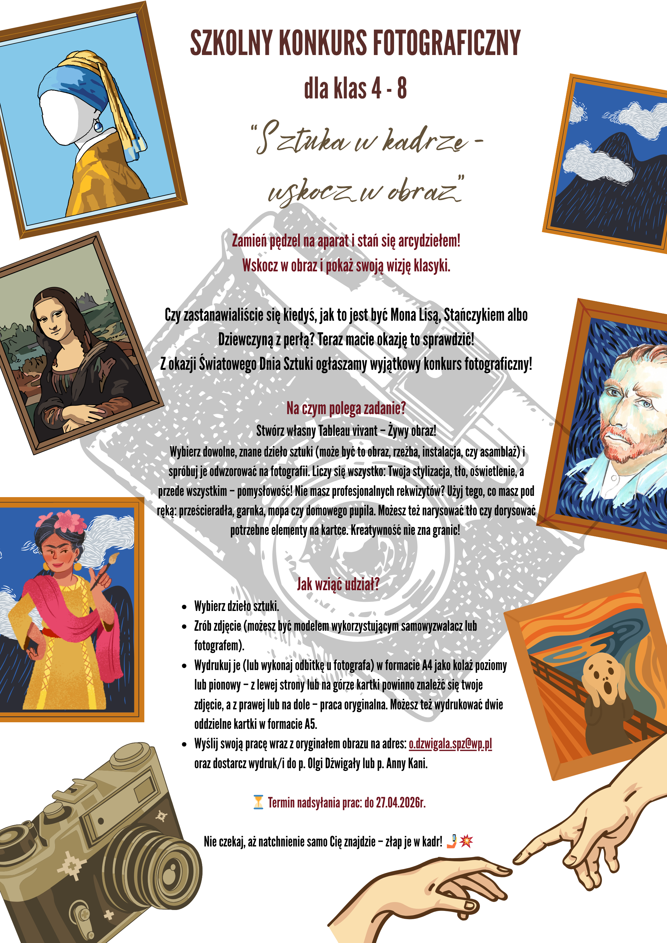 Czy zastanawialiście się kiedyś, jak to jest być Mona Lisą, Stańczykiem albo Dziewczyną z perłą? Teraz macie okazję to sprawdzić! Z okazji Światowego Dnia Sztuki ogłaszamy wyjątkowy konkurs fotograficzny!