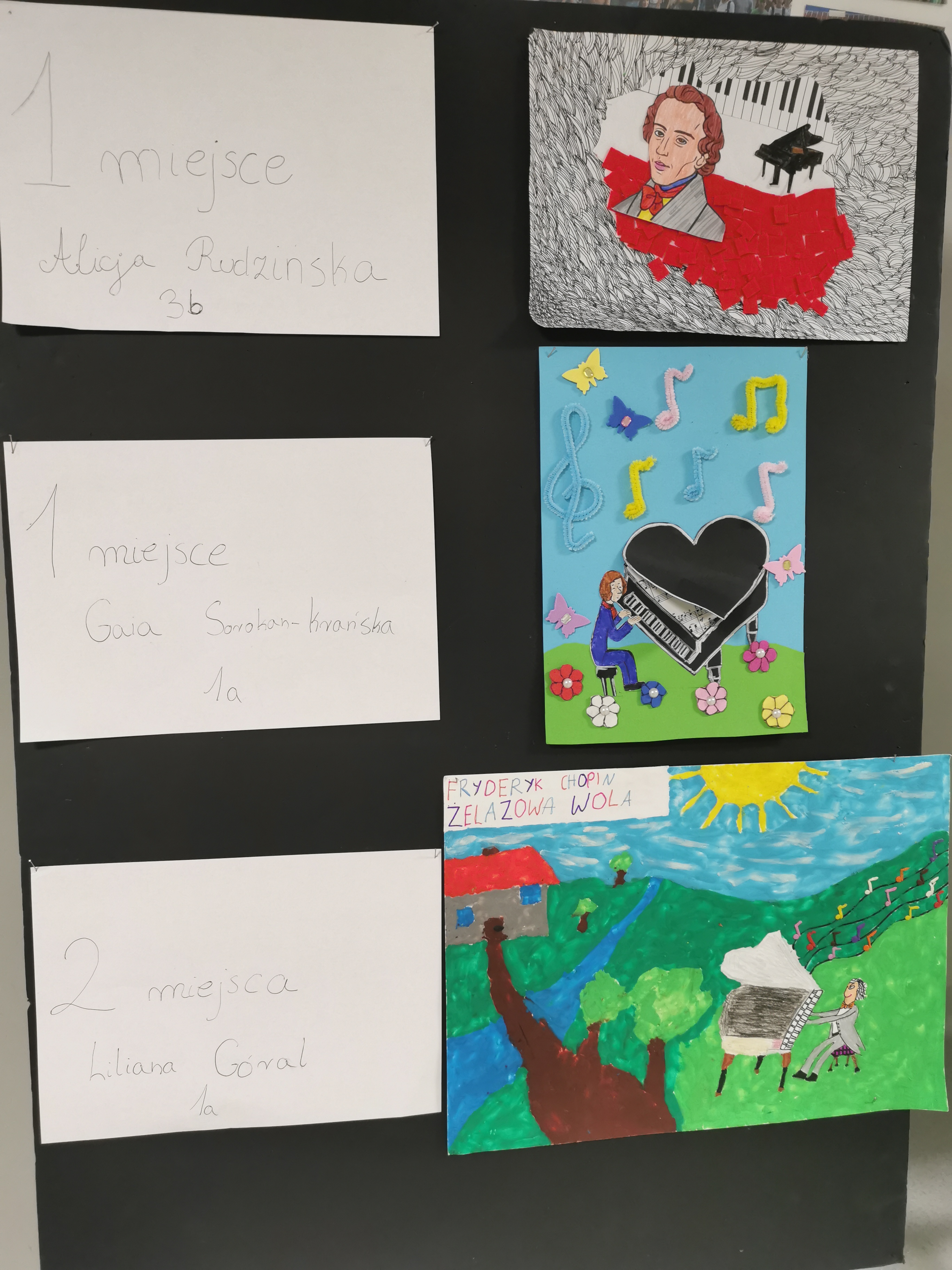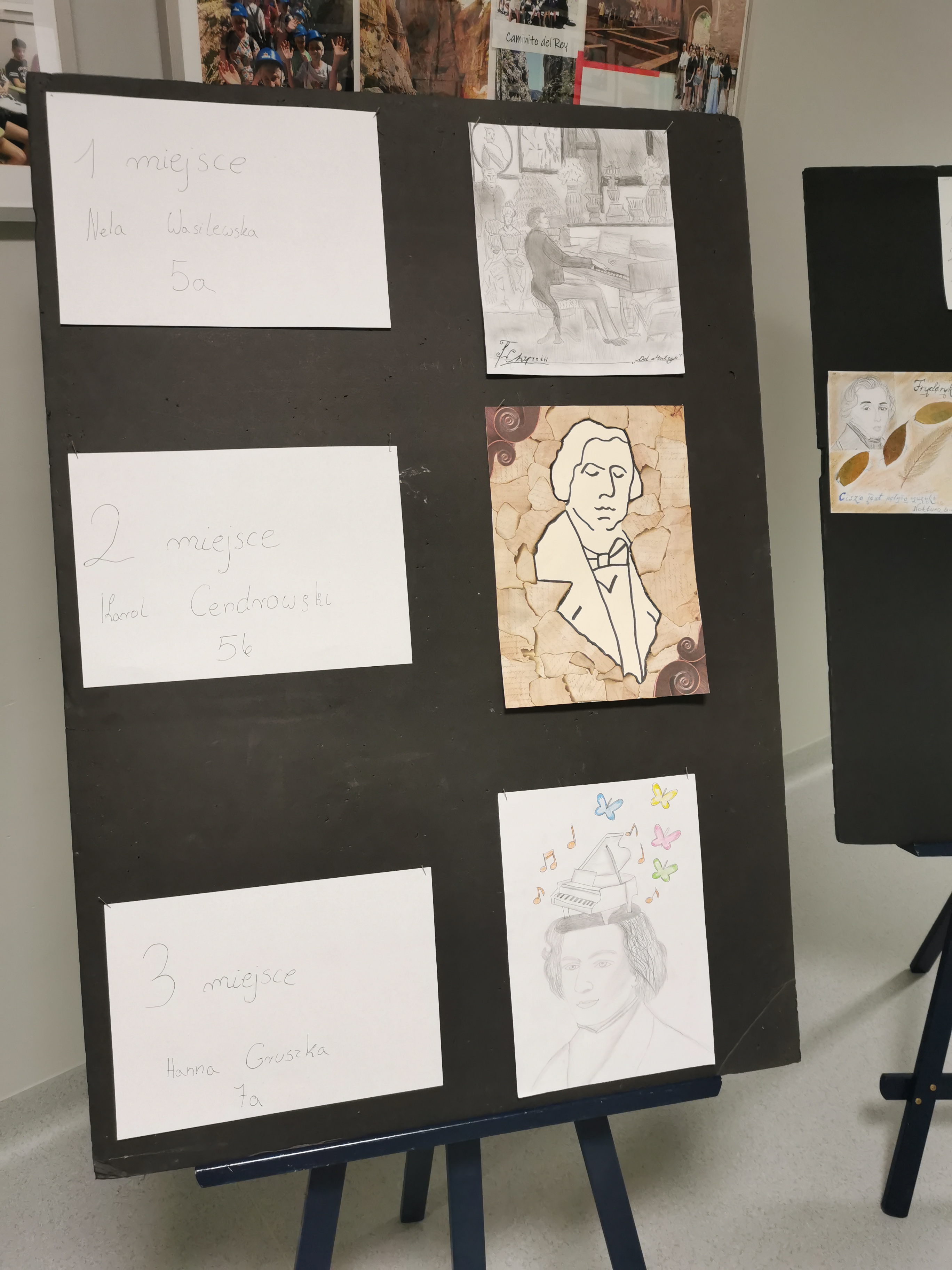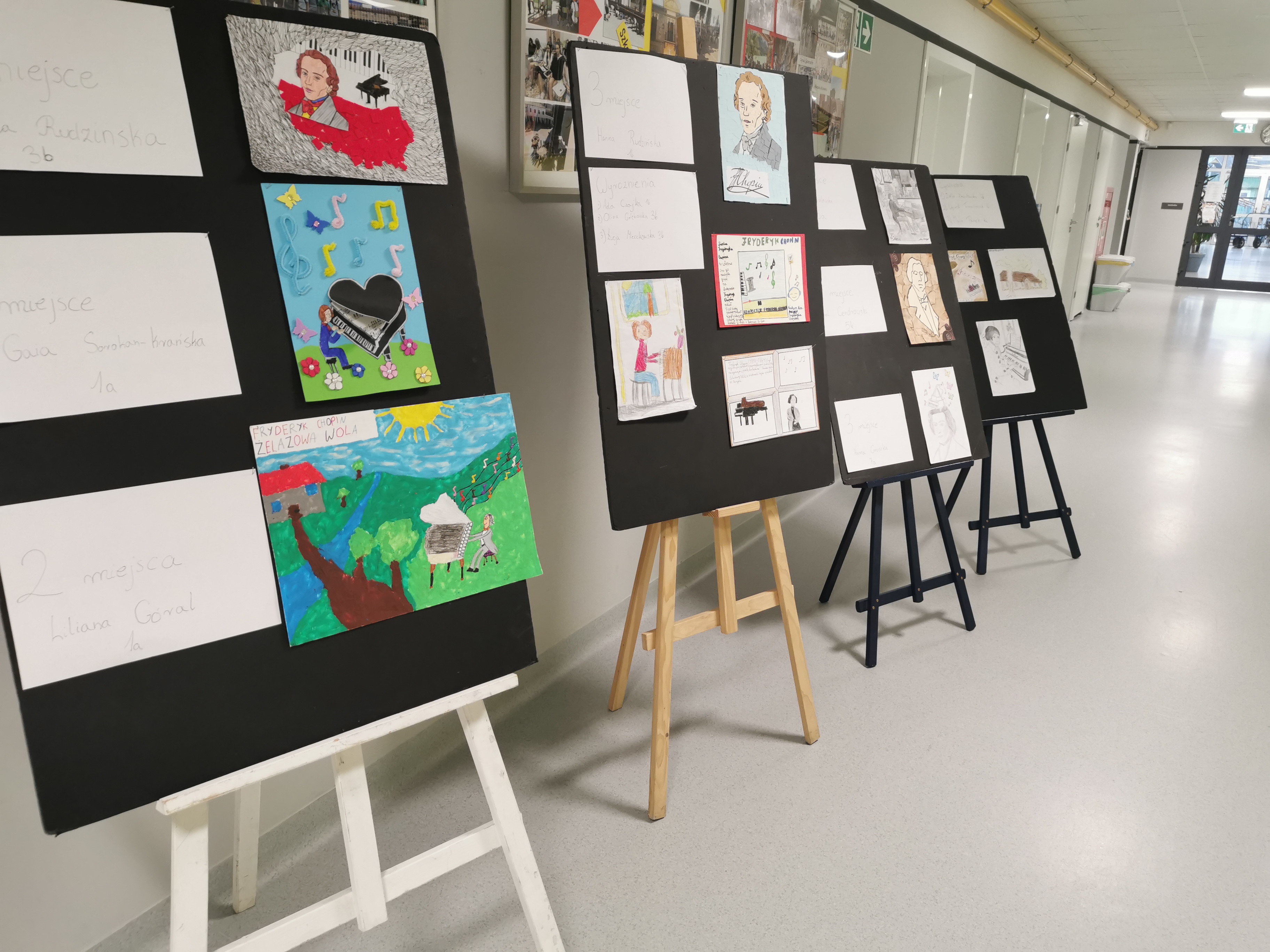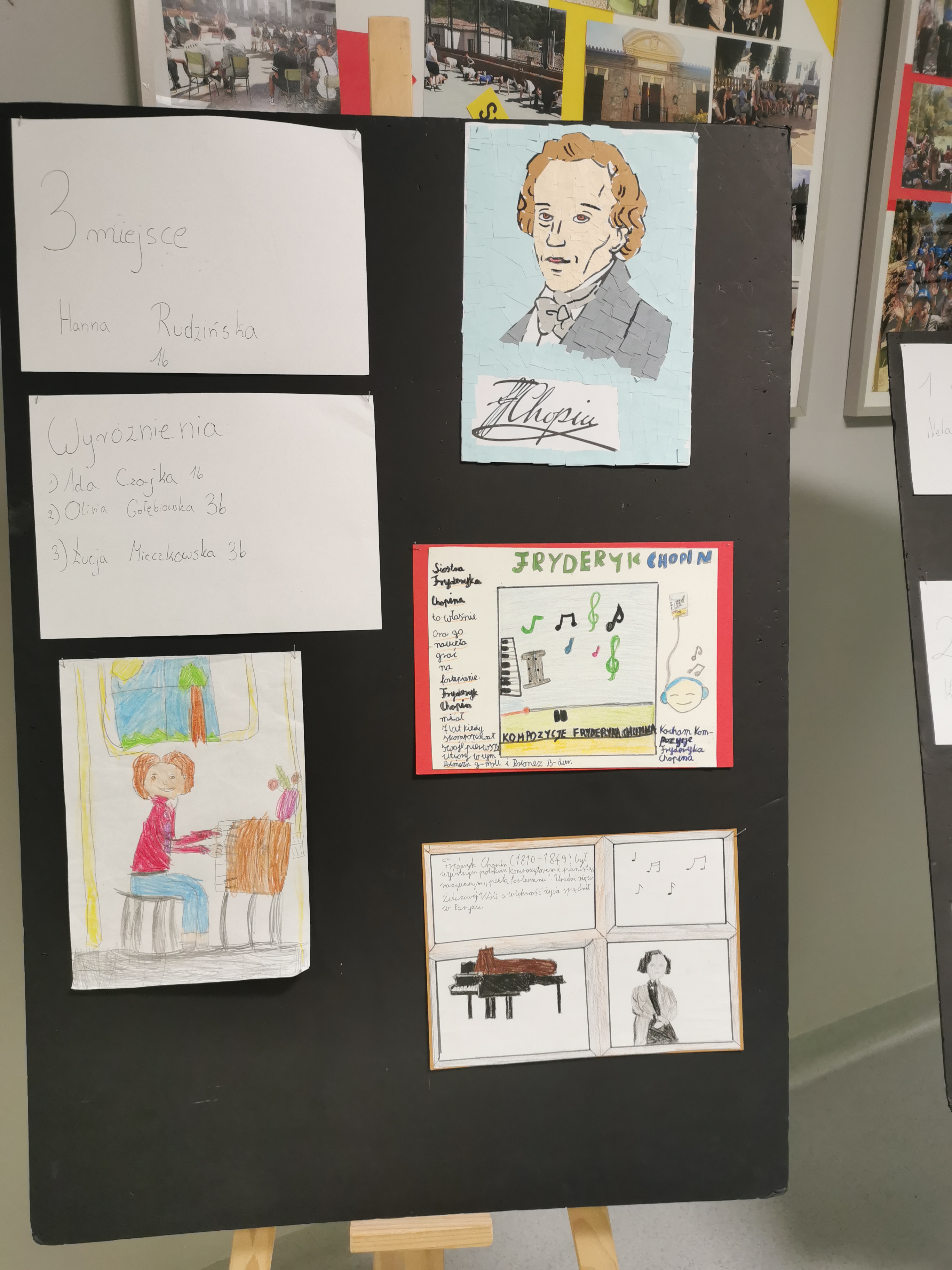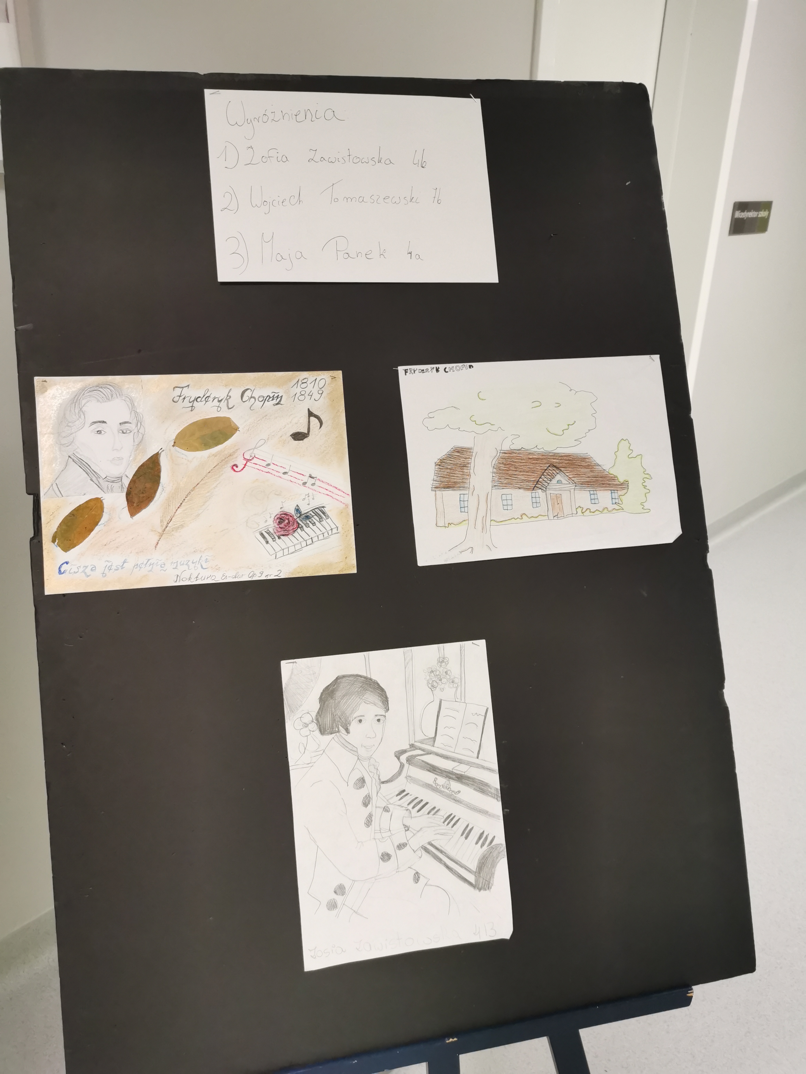 Nie zabrakło również kreatywnego akcentu – uczniowie wzięli udział w konkursie plastycznym o Fryderyku Chopinie, dzięki czemu szkolne korytarze wypełniły się kolorami i artystycznymi pomysłami.