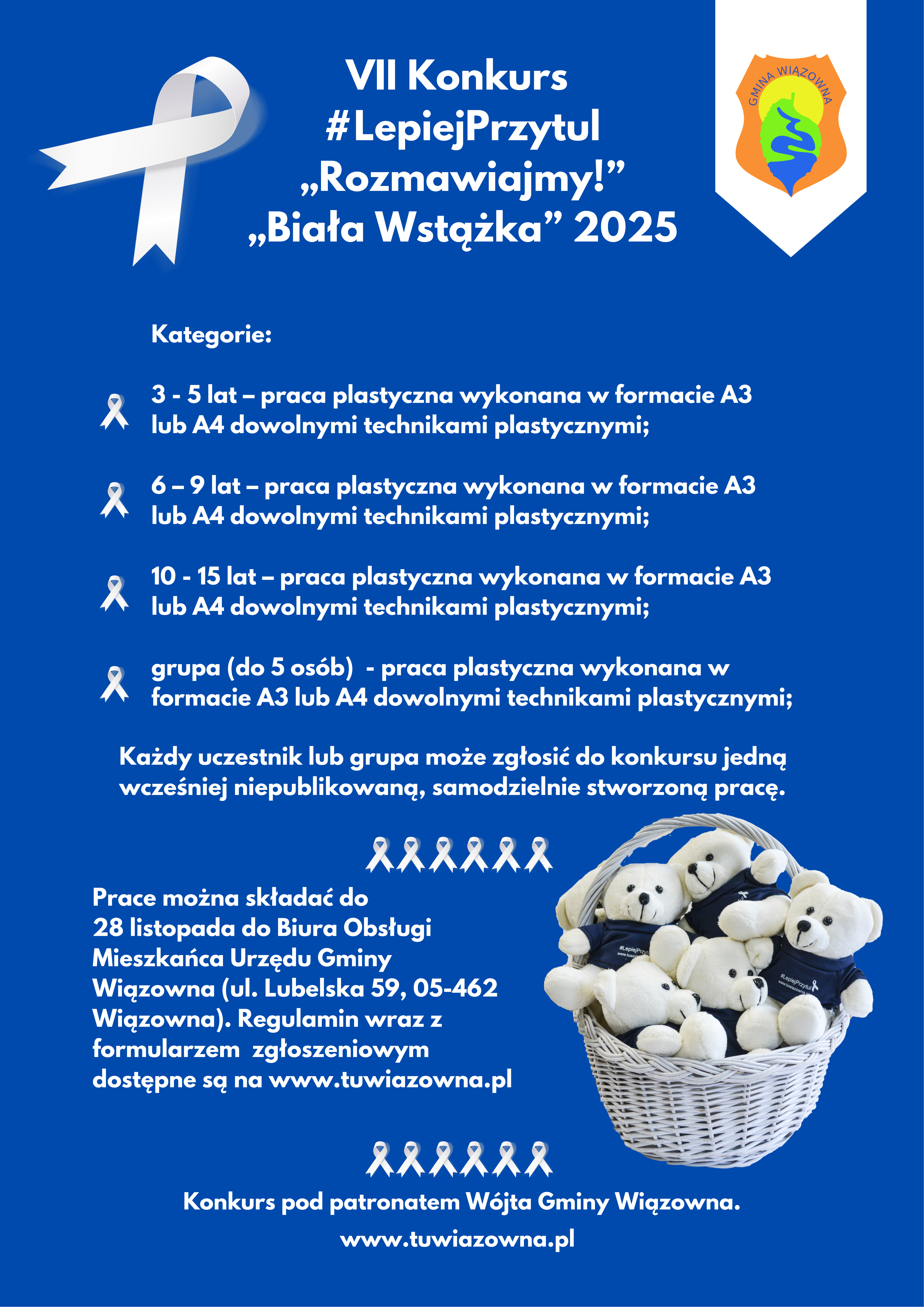 Więcej informacji na temat konkursu oraz akcji „Biała Wstążka” 2025 udziela Izabela Trzaska, Wydział Spraw Społecznych, tel. 22 512 58 35, e-mail: i.trzaska@wiazowna.pl.